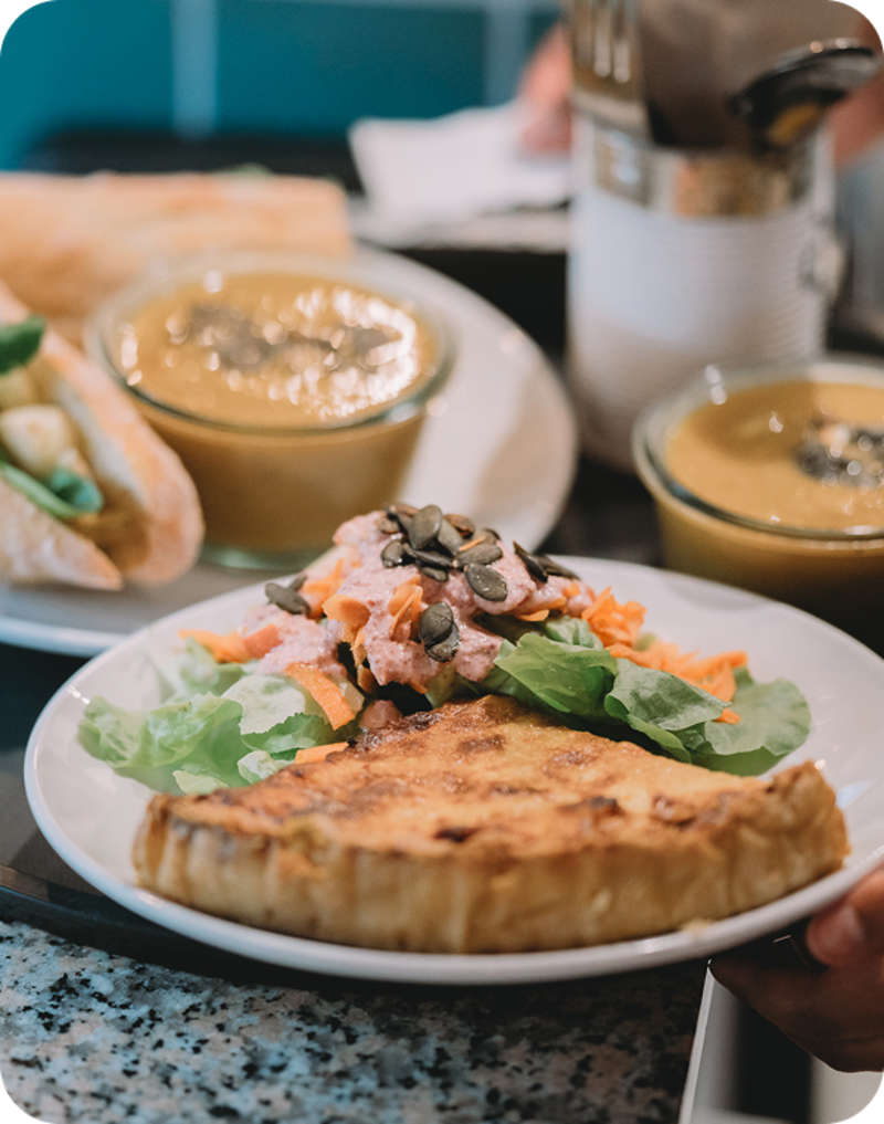 Ouvert à toutes et tous, le resto est un endroit convivial pour discuter et travailler. Une douceur à toute heure, un lunch à midi, et un large choix de softs, bières, cafés et thés de spécialité. On cuisine de saison et on sert du local. Tout est fait maison. Quand le soleil est de la partie, on sort la terrasse dans la grande cour intérieur arborée.